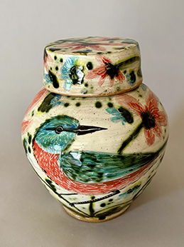 Deb Kuzyk’s Bluebird Ginger Jar, 2025, 9” h x 6” diam. Stoneware is so very elegant, with its wraparound bird imagery, and also very useful! $450 value
