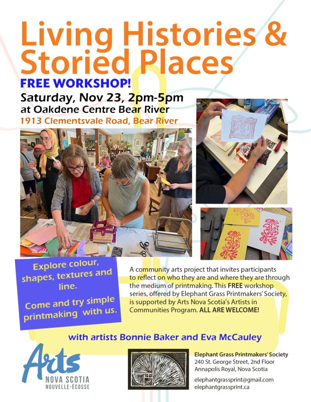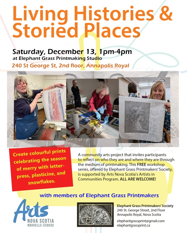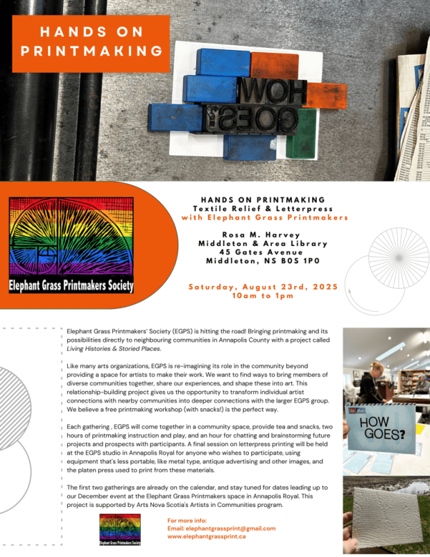 Try something new! Elephant Grass Printmakers’ Society (EGPS) is hitting the road!  Bringing printmaking and its possibilities directly to neighbouring communities in Annapolis County with a project called Living Histories & Storied Places. Like many arts organizations, EGPS is re-imagining its role in the community beyond providing a space for artists to make their work. We want to find ways to bring members of diverse communities together, share our experiences, and shape these into art by offering free workshops and making new connections.  Our first two gatherings are already on the calendar, and stay tuned for dates leading up to our December event at the Elephant Grass Printmakers space in Annapolis Royal.