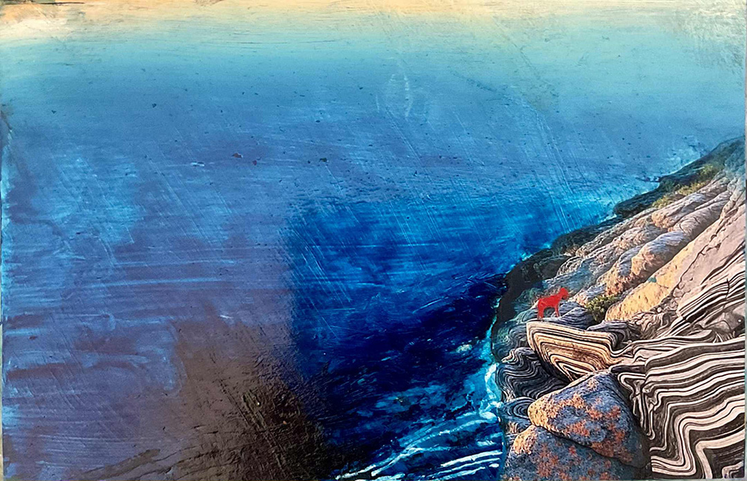 Wayne Boucher, The Red Pony Stuck, painting and collage, 7.5 x 12” $500 value. Who wouldn’t want to win an original Wayne Boucher creation from his recent Red Pony series?!