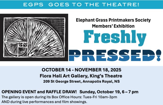 Freshly Pressed, an exhibit of prints by Elephant Grass Printmaker members runs Oct 14-Nov 18 at the Flora Hall Art Gallery, King’s Theatre, 209 St George Street, Annapolis.