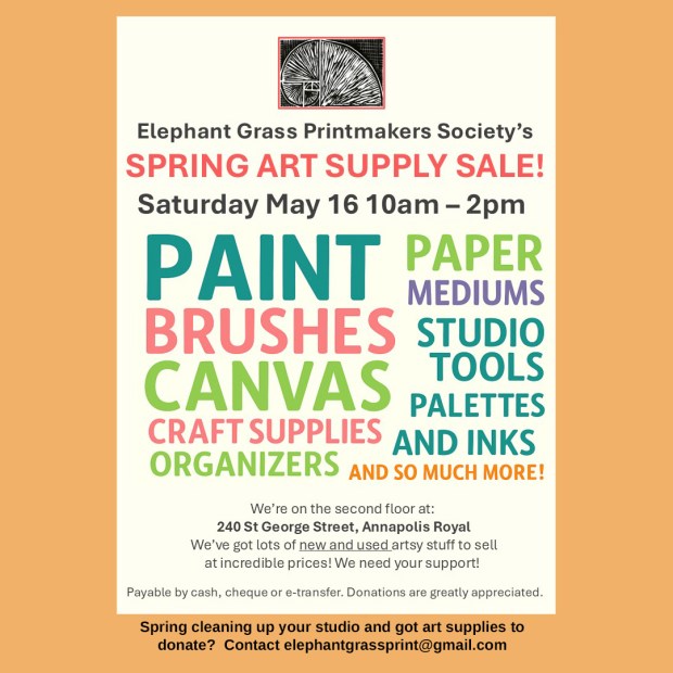 Curious about the art of hand printing but unsure where to begin? Wrap up your summer and join Elephant Grass Printmakers for a morning of hands-on printmaking demonstrations on September 13, 9am-1pm at Annapolis Royal Farmers Market in Annapolis Royal. We will be there to help you ink and print your own mini relief print.
