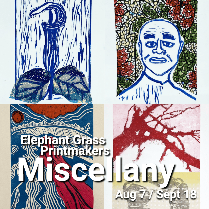 Miscellany is defined as “a group or collection of different items: a mixture”. Miscellany is also a useful description for the assorted talents of members of Elephant Grass Printmakers Society. As individuals, we each approach printmaking with personal thematic visions. We each favour different technical applications. And, though we teach and encourage each other, we do not imitate. Elephant Grass Printmakers is a collection of differences: a hodgepodge of a variety.